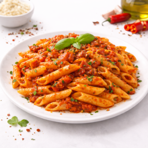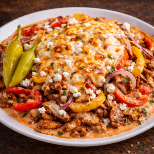 mit Hirtenkase, Peperoni, Zwiebeln, Paprika-Mix & Tomaten-Sahnesauce überbacken