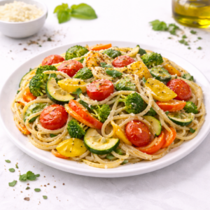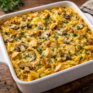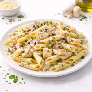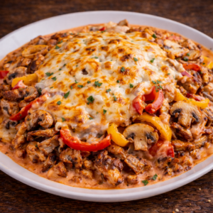 mit fr. gebratenen Champignons, Paprika & Tomaten-Sahnesauce überbacken