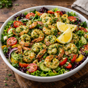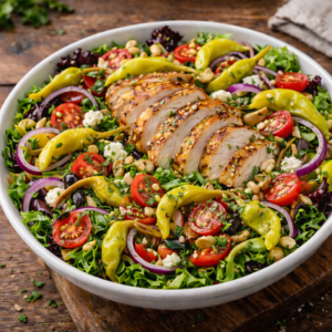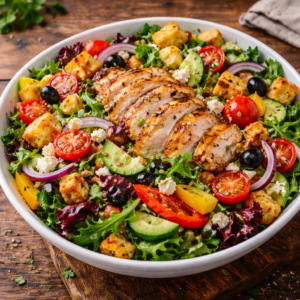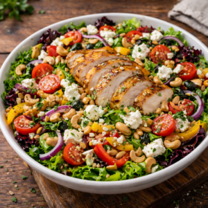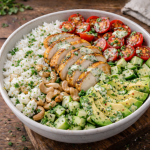 mit Basis-Reis, gebratener Hähnchenbrust, Cherrytomaten, Cashewkerne, Avocado, Gurken, Feta und Krauter-Dressing