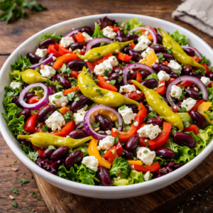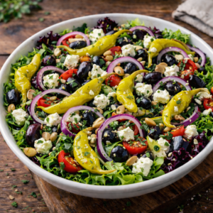(vegetarisch) mit roten Zwiebeln, Hirtenkase, Peperoni und Oliven