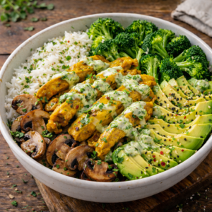 mit Basis-Reis, Avocado, Broccoli, Champignons, gebratenen Hähnchenbrust-Streifen in Currysauce & Kräuter-Dressing