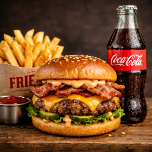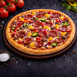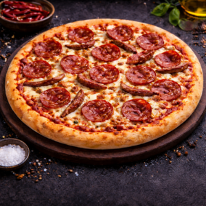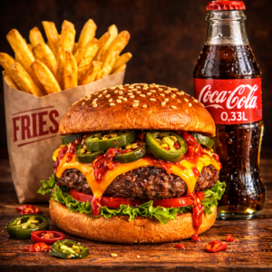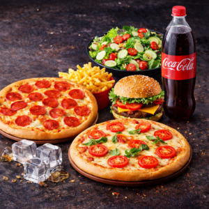 2 mittelgroße Pizzen: 1x Pepperoni + 1x Margherita, 1x klassischer Burger, 1 Pommes + 1 frischer Salat, 1 x 1,0l Getränk (nach Wahl)
