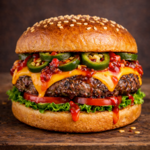 (scharf) mit 100g Fleisch, Jalapenos, Cheddar und Hot-Chilisauce
