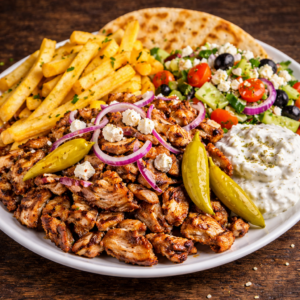 mit roten Zwiebeln, Hirtenkäse, Gyros und würziger Sauce