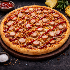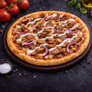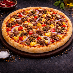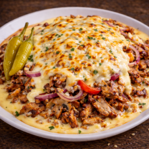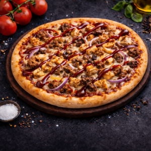 Rinderhackfleisch, Hähnchen, Zwiebeln, BBQ-Sauce, Käse