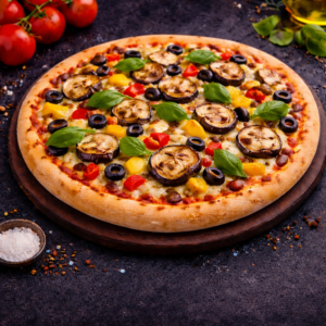 mit Tomatensauce, Mozzarella, Auberginen, Paprika, Oliven und Basilikum