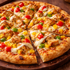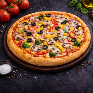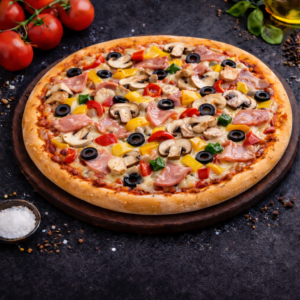 mit Tomatensauce, Mozzarella, Champignons, Paprika, Mais, Oliven, Zwiebeln