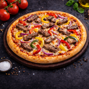 mit Paprika, Zwiebeln, Peperoni und Rindersalami