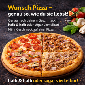 Stell dir deine Pizza selbst zusammen. Halb & Halb oder sogar in vier verschiedenen Sorten!