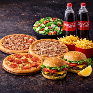 3 mittelgroße Pizzen: 2x nach Wahl + 1x Thunfisch, 2 x Klassische Burger + 2x Pommes + 1 großer frischer Salat, 2 x 1,0 l Getränke (nach Wahl)