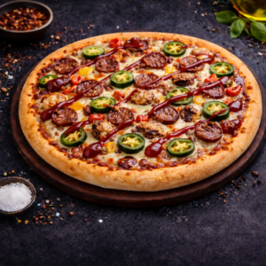 mit Mozzarella, scharfe Rinderwurst, Jalapeños, Chilisauce